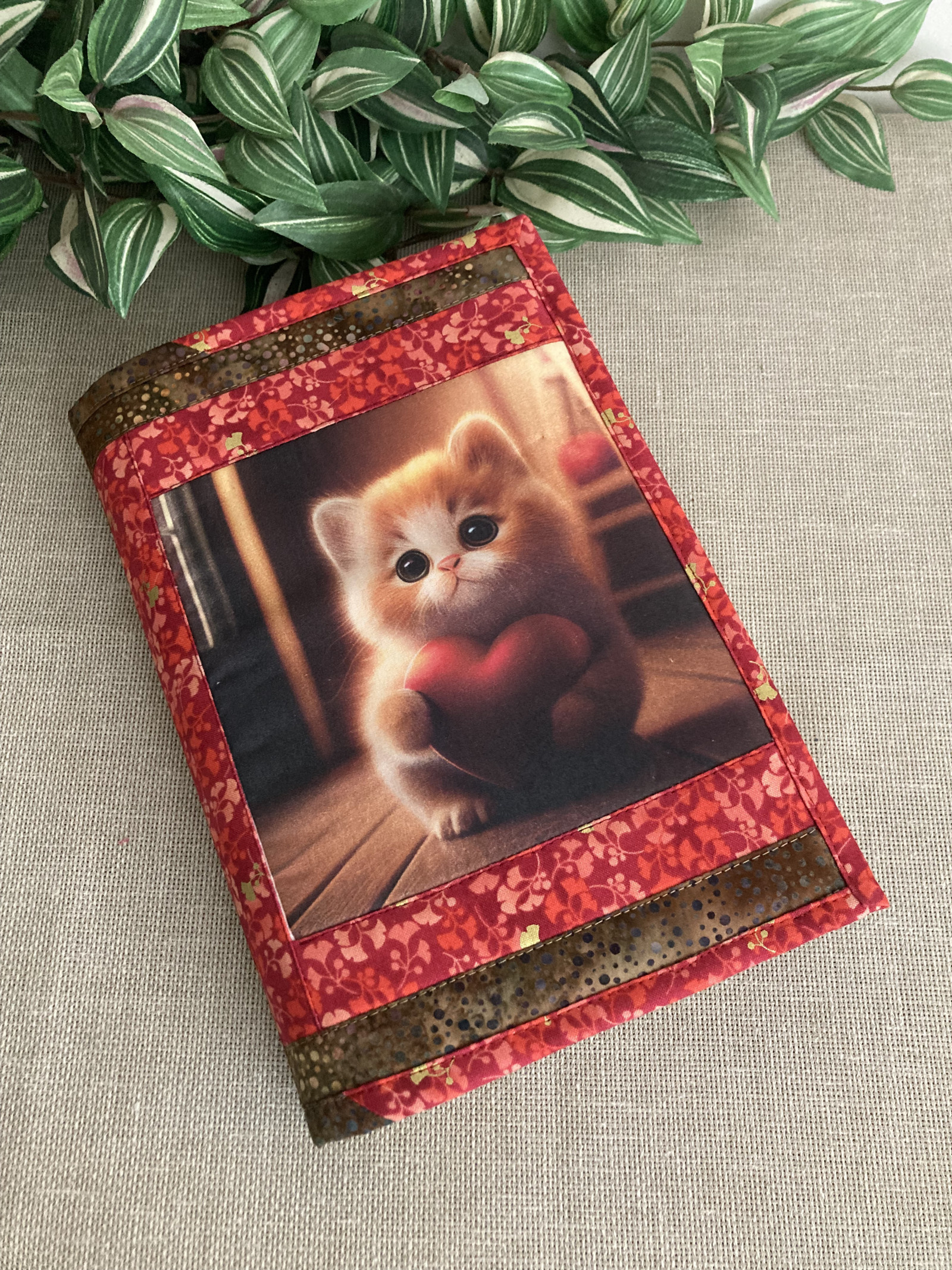 Stylový, měkký látkový obal , který může proměnit jakýkoli váš standardní denní zápisník nebo Váší knihu, a dát jim jedinečný styl a osobnost. Je vhodný i pro objemnější knihy a pro výšku knih do 23 cm. Je to zamýšleno tak, že ohýbací část slouží jako záložka do knihy. Je tedy možné vložit tuto ohýbací část dovnitř mezi stránky rozečtené knihy a knihu zavřít.Obal je vyrobeny technikou patchwork z odolné bavlněné kvalitní zahraniční látky. Všechno je pečlivě prošité a vyztužené, žádné zbytečné detaily a otevřené švy. V případě potřeby lze prát, nejlépe jemnými prostředky, v teplé vodě, osušit ručníkem, sušit v narovnaném stavu,v případě potřeby žehlit žehličkou na teplotu pro bavlnu.