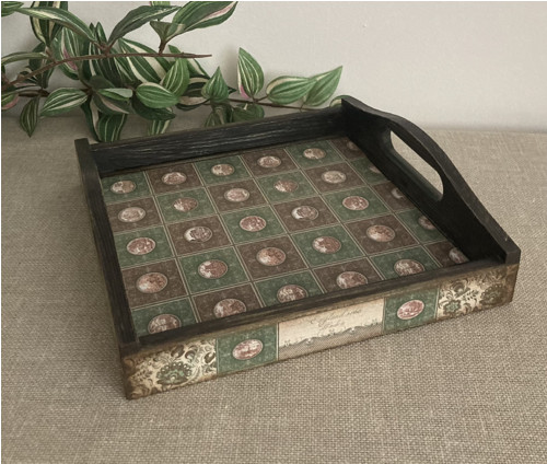 Dřevěný podnos, tac o velikosti 24 x 24 cm. Je vyrobený ze smrkového dřeva technikou decoupage, zdobený objemným vzorem, patinovaný, mořený, malovaný akrylovou barvou, natřený dvoubarevným nátěrem, matným akrylovým lakem a specialním voskem pro snadnou údržbu. Podnos se stane nepostradatelným pomocníkem jak v městském bytě, tak ve venkovském domě nebo na chalupě.