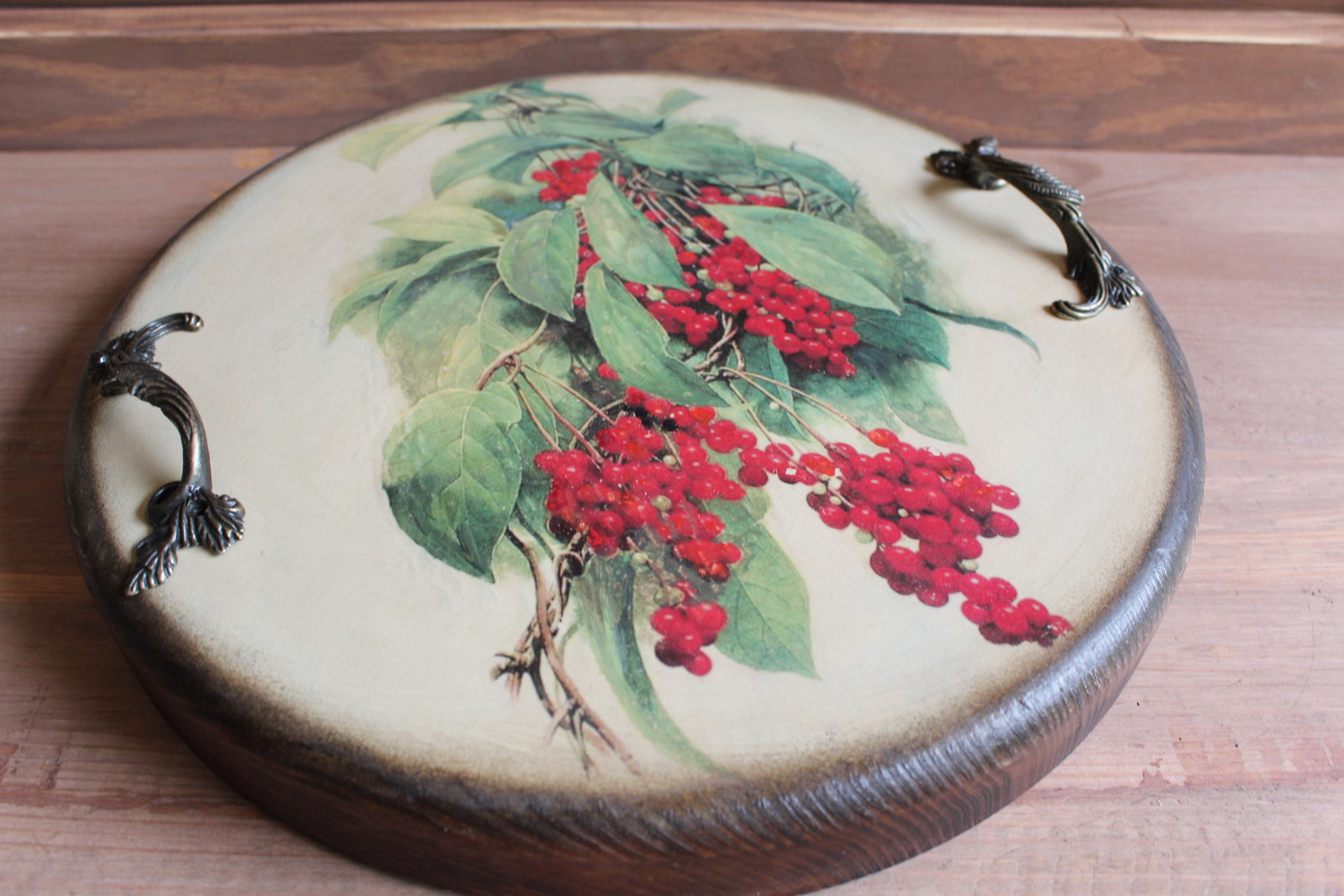 Dřevěné prkénko je nezbytným pomocníkem v kuchyni. Díky svému originálnímu designu je výborným doplňkem při servírování či na párty. Dřevěné prkénko o průměru 27 сm a tloušťce 3 cm. vyrobeno z prvotřídního bukového dřeva. Ozdobeno technikou přenos obrázků a ručně domalováno .