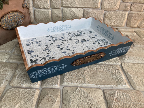 Dřevěný podnos, tac o velikosti 32,5 x 23 x výška 5,5 cm. Je vyrobený ze smrkového dřeva a dekorativní keramické dlaždice. , zdobený objemným vzorem, patinovaný, mořený, malovaný akrylovou barvou, natřený dvoubarevným nátěrem, matným akrylovým lakem a specialním voskem pro snadnou údržbu. Podnos se stane nepostradatelným pomocníkem jak v městském bytě, tak ve venkovském domě nebo na chalupě. Na podnos lze položit jakékoliv horké předměty.