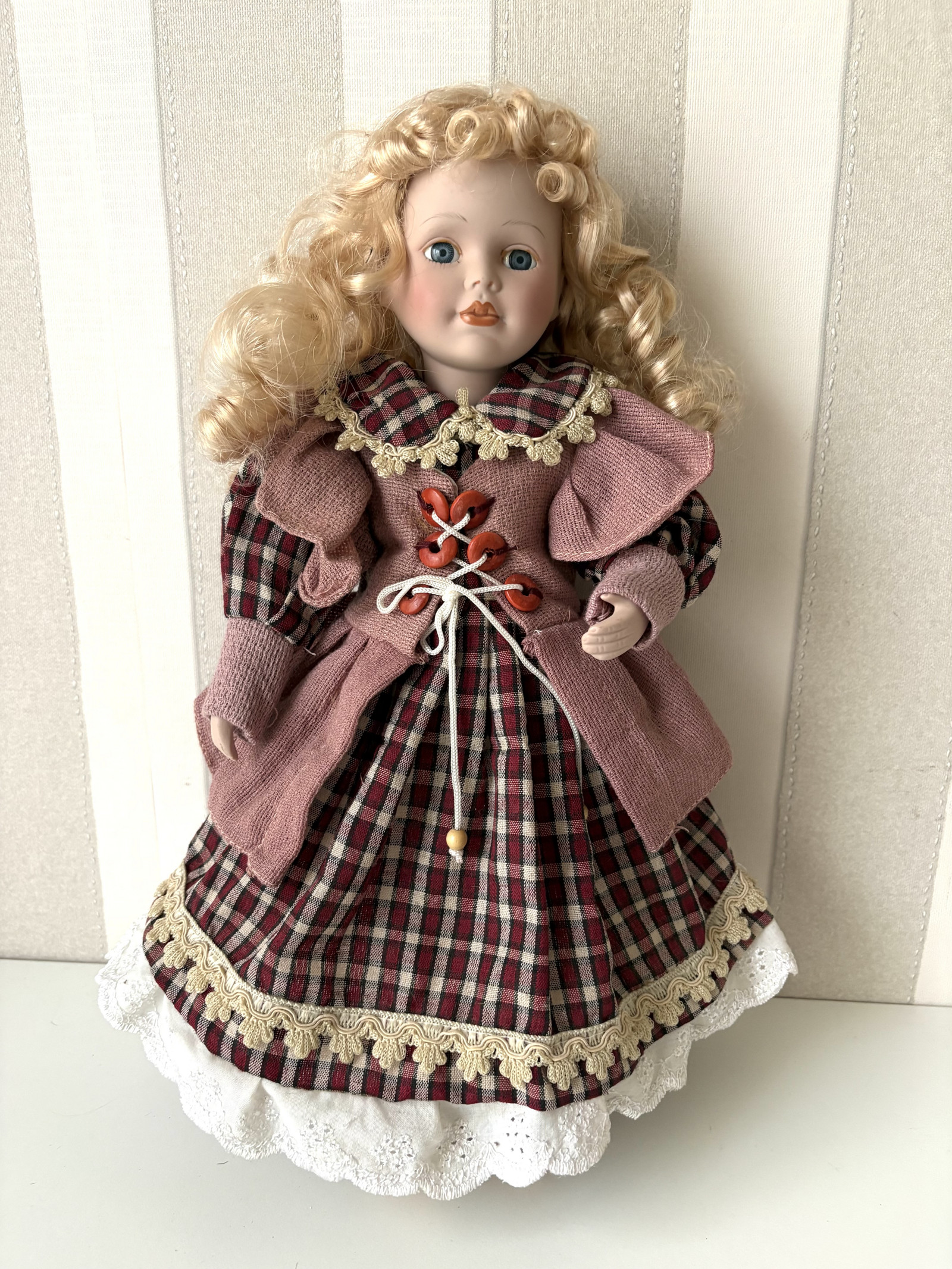 Tato porcelánová panenka jménem Alexandra je ručně vyrobená panenka určena pro milovníky starožitných věcí. Materiál: obličej, ruce a nohy jsou částečně z porcelánu, zbytek je z vaty. Má krásné šaty, dlouhé blond vlasy a modré očí. Má také starožitné spodní pradlo, podkolenky a na nohou botičky kremové barvy.