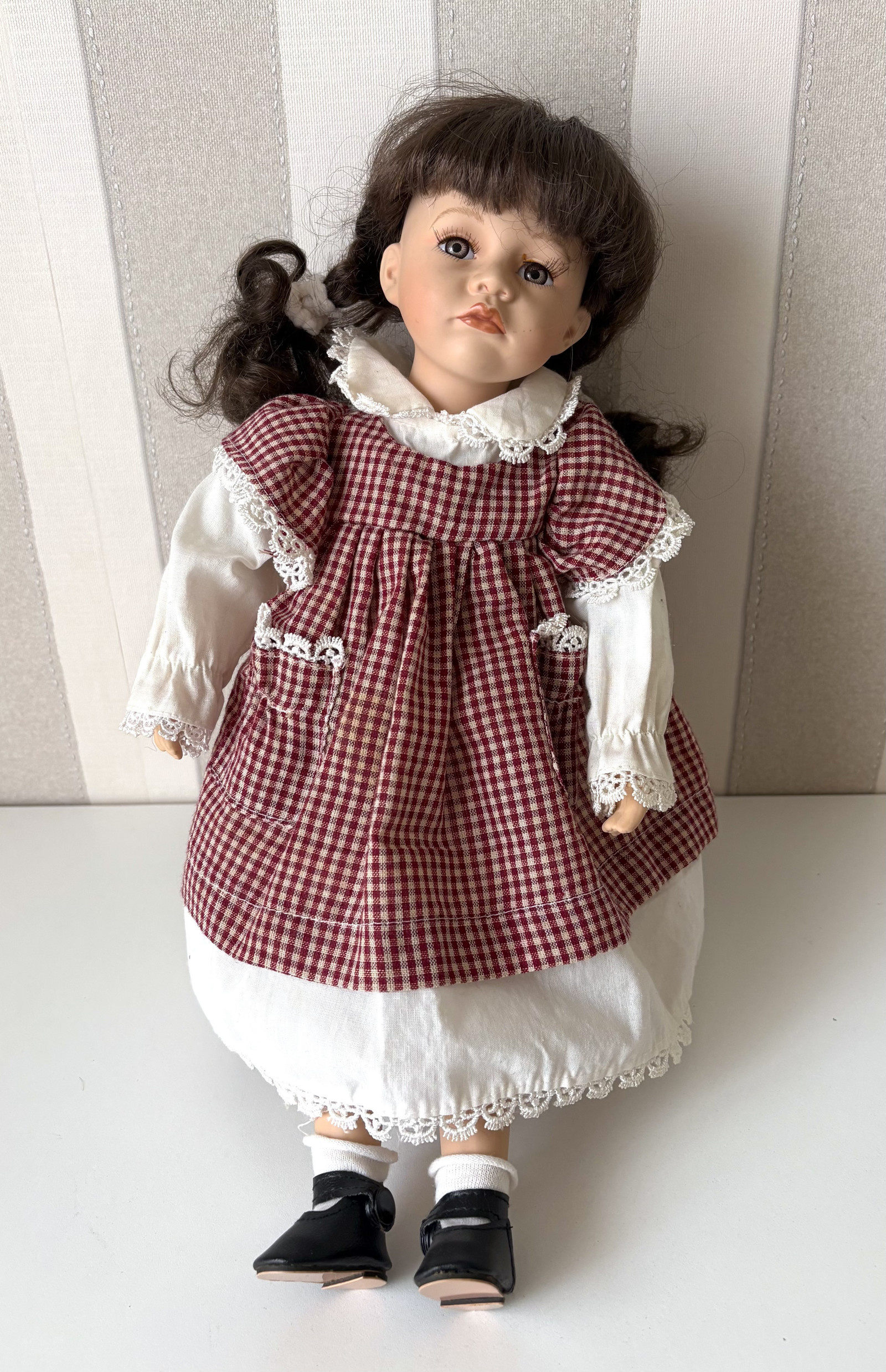 Materiál: obličej,ruce a nohy jsou částečně z porcelánu, zbytek je z vaty. Má krásné šaty s kostkovaným motivem, hnědé vlasy, hnědé oči s dlouhými řasy. Má také starožitné spodní prádlo, punčohy a na nohou botičky černé barvy. Je umístěna na stojanu, díky kterému ji můžete obdivovat v celé její kráse.