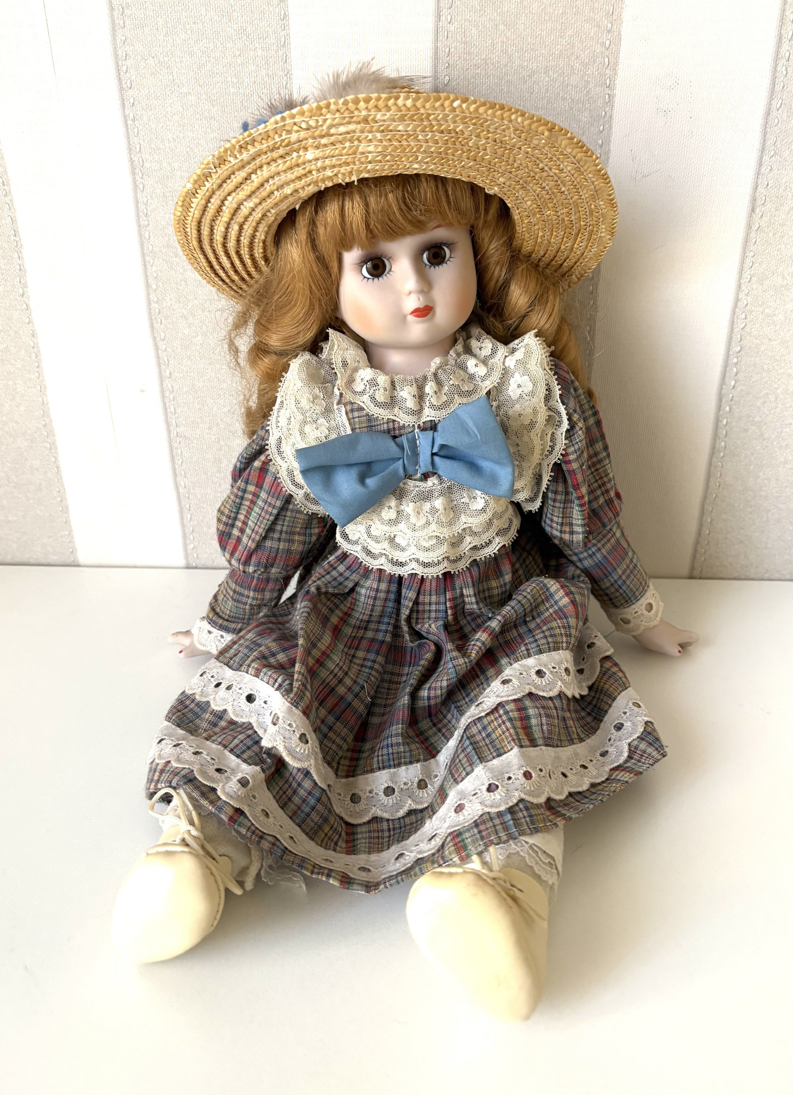 Materiál: obličej, ruce a nohy jsou částečně z porcelánu, zbytek je z vaty. Má kostkované šaty, blond vlasy, a klobouček na hlavě. Má také starožitné spodní prádlo a na nohou punčohy a botičky kremové barvy.