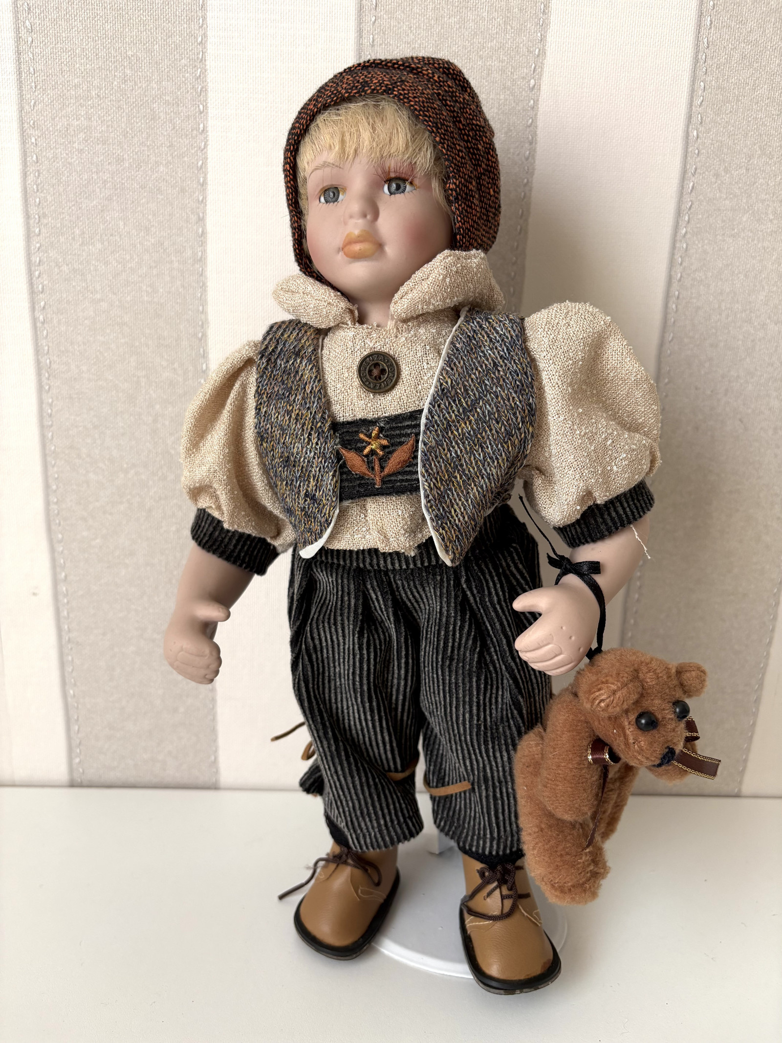 Materiál: obličej, ruce a nohy jsou částečně z porcelánu, zbytek je z vaty. Má šedé očí, krásný starožitný kostýmek, blond vlasy, a na hlavě čepici. V ruce má mědvídka. Na nohou má černé punčohy a botičky ochrové barvy.