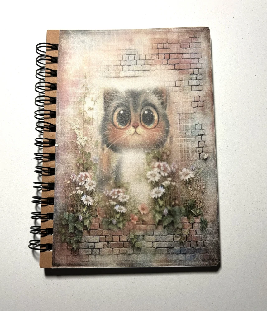 Poznámkovník ve velikosti 10,5 x 14 cm, vhodný pro drobné poznámky. Je s boční kroužkovou vazbou. Zápisníček obsahuje 60 listů papíru.  Je skvělým doplňkem např. na cesty, na poznámky, pro umělce, studenty, jako deník, linkovaný cestovní zápisník, vhodný pro školu, podnikání, kancelářské potřeby atd.Zápisník ve velikosti 8,5 x 13,5 cm, vhodný pro drobné poznámky. Je s boční kroužkovou vazbou. Desky jsou zdekorovány technikou decoupage. Zápisníček obsahuje 60 listů papíru.  Je skvělým doplňkem např. na cesty, na poznámky, pro umělce, studenty, jako deník, linkovaný cestovní zápisník, vhodný pro školu, podnikání, kancelářské potřeby atd.