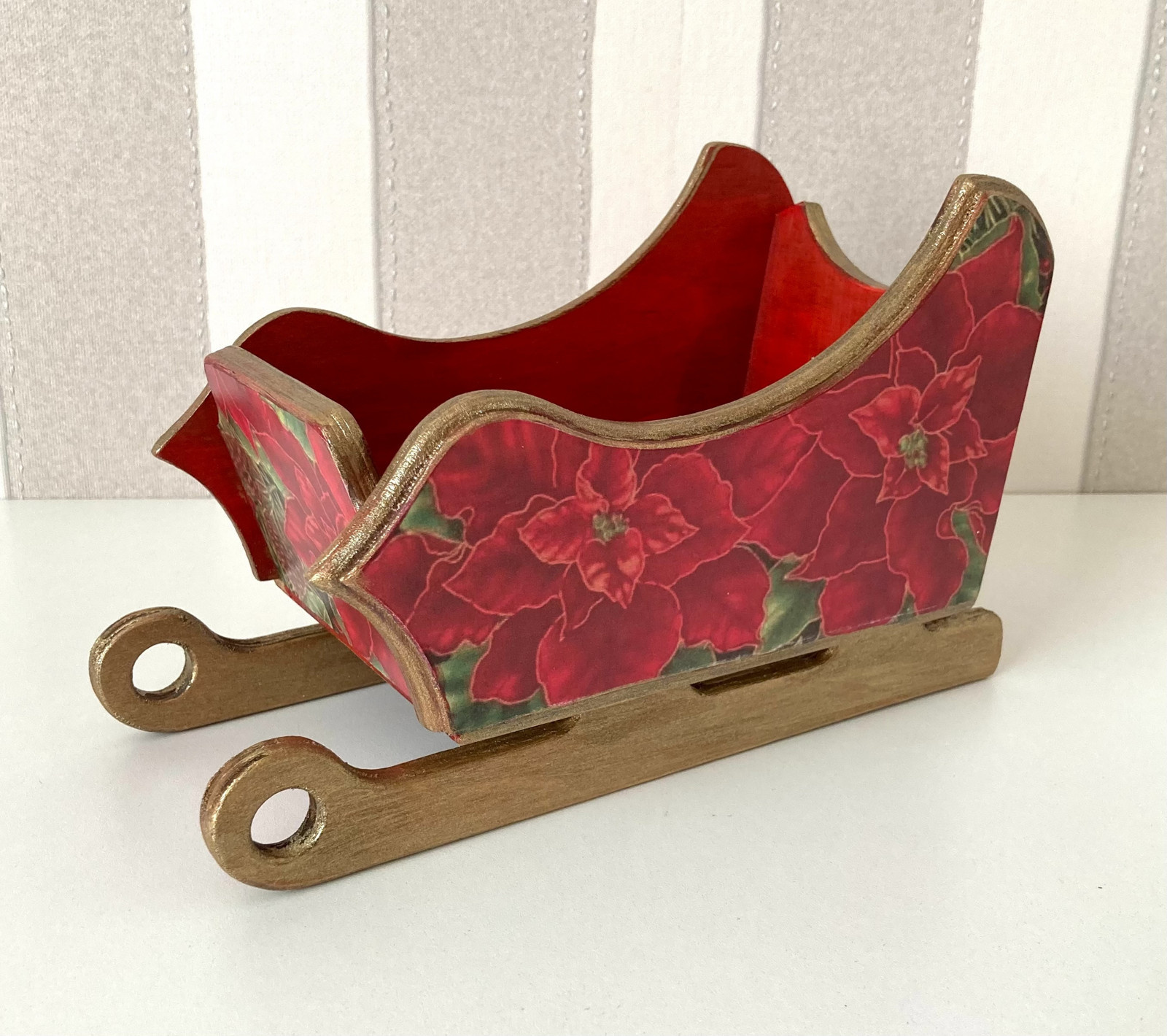Ručně vyrobený podstavec na láhev, krabička na bonbony nebo na vánoční ozdoby. Je vyrobená z lipového dřeva a zdobená různými dekoračními technikami včetně techniky decoupage a ručně domalovaná. Je natřená akrylovými barvami a důkladně přelakován kvalitním akrylovým lakem . Je určená pro standartní láhev vína, šampaňského nebo jako nádoba na bonbóny. Lze otírat vlhkým hadříkem.