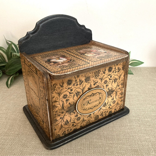 Slánka dřevěná krabička na sůl nebo bobkový list ve provence provedení. Rozměry: 15 x 11 x 11 cm, výška se zadním zdobením je 16,5 cm. Je zdobená technikou decoupage. Krabička je natřena akrylovými barvami a důkladně přelakována akrylovým lakem. Uvnitř je přírodní.