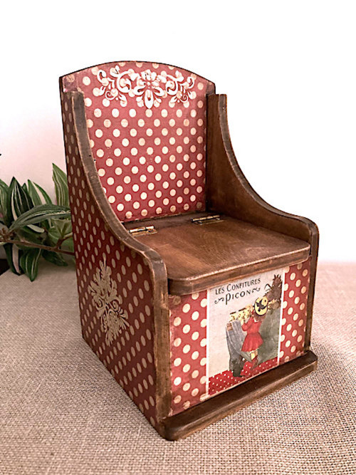 Slánka dřevěná krabička na sůl nebo bobkový list ve vintage provedení. Rozměry: 12 x 12 x 10 cm, výška se zadním zdobením je 20 cm. Je zdobená technikou decoupage. Krabička je natřena akrylovými barvami a důkladně přelakována akrylovým lakem. Uvnitř je přírodní.