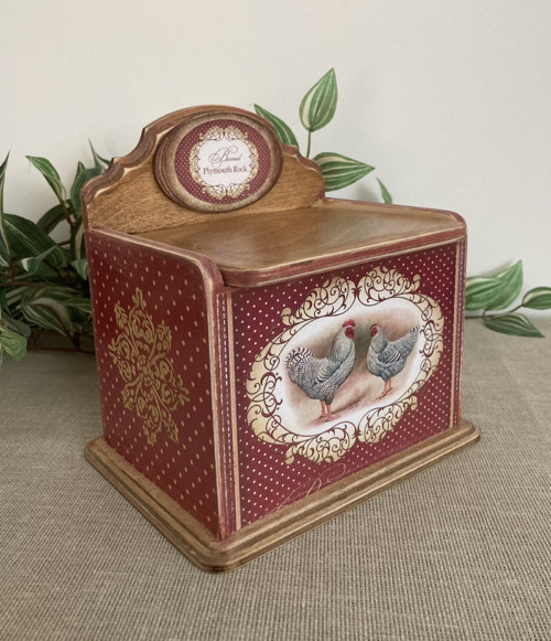 Slánka dřevěná krabička na sůl nebo bobkový list ve provence provedení. Rozměry: 15 x 11 x 11 cm, výška se zadním zdobením je 16,5 cm. Je zdobená technikou decoupage. Krabička je natřena akrylovými barvami a důkladně přelakována akrylovým lakem. Uvnitř je přírodní.