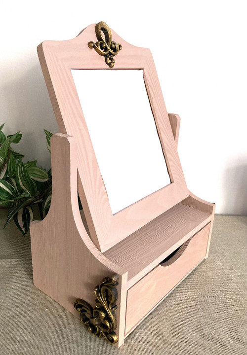 Dřevěná toaletka - šperkovnice se zrcadlem, která se bude hodit pro uschování různých drobností, sponek, prstýnků, korálků atd. Je to pěkný dárek i pro každou ženu. Šperkovnice ozdobí každou ložnici a kosmetický stůl. Má vysouvací šuplíček do kterého můžete ukládat například šperky, prstýnky nebo kosmetické potřeby.Toaletka je vyrobena z kvalitního borovicového dřeva a borovicové překližky. Je zdobena pomocí různých technik a jemně patinovaná.Dále je natřená akrylovou barvou, akrylovým lakem a specialním voskem pro snadnou údržbu.Velmi pěkné a kvalitní provedení.