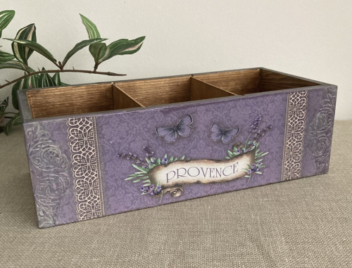 Stojánek na tužky nebo dálkové ovladače. Rozměr 29 x 9 cm, rozměr jednoho políčka 6 x 8 x hloubka 9,5 cm. Celková výška 10 cm. Praktický pomocník pro školáky, do kuchyně, na psací stůl. Můžete využít i jako atypickou vázičku na suché květiny. Stojanek je zdobený pomocí různých technik, hlavně technikou decoupage. Povrch je lakován kvalitním akrylovým lakem.