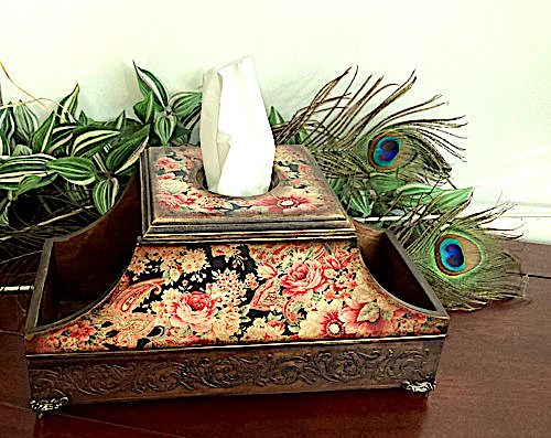 Stojan, organizér, krabička na ubrousky, kuchyňský box, kosmetický box. Pohodlná a funkční věcička. Své místo si najde v předsíni s hřebeny, v ložnici s krémy, nebo i na pracovní ploše či v kuchyni. Vintážní a jemná dekorace, chráněná vícevrstvým lakováním, s efektem lehkého zestárnutí. V ložnice je to velmi originální věc, která obsahuje dvě funkce: držák na ubrousky a stojánek na kosmetiku. Tuto věc jsem nazvala - Make-up-nice. Jedná se o velmi krásný, a co je nejdůležitější, velmi funkční předmět na vašem toaletním stolku. Abyste si mohli udělat ranní a večerní make-up, nemusíte se dlouho hrabat s hledáním ubrousků, vatových tamponů a hlavně není problém, kde a jak je uložit. Vše je vždy po ruce!