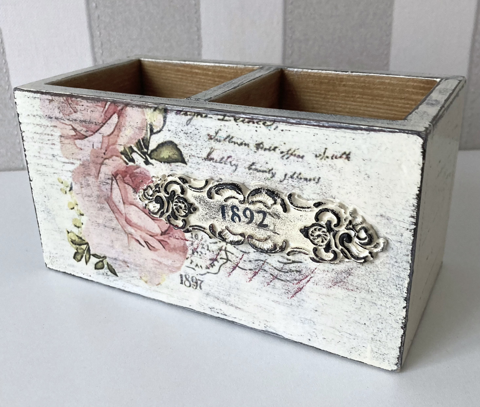 Dřevěná otevřená krabička - stojánek na tužky, pera, kancelářské drobnosti - nebo na příbory - nebo na kartáče, hřebeny. Je zdobena pomocí různých technik, hlavně technikou decoupage. Povrch je lakován kvalitním akrylovým lakem. Uvnitř je mořená přírodním mořídlem a lakovaná.