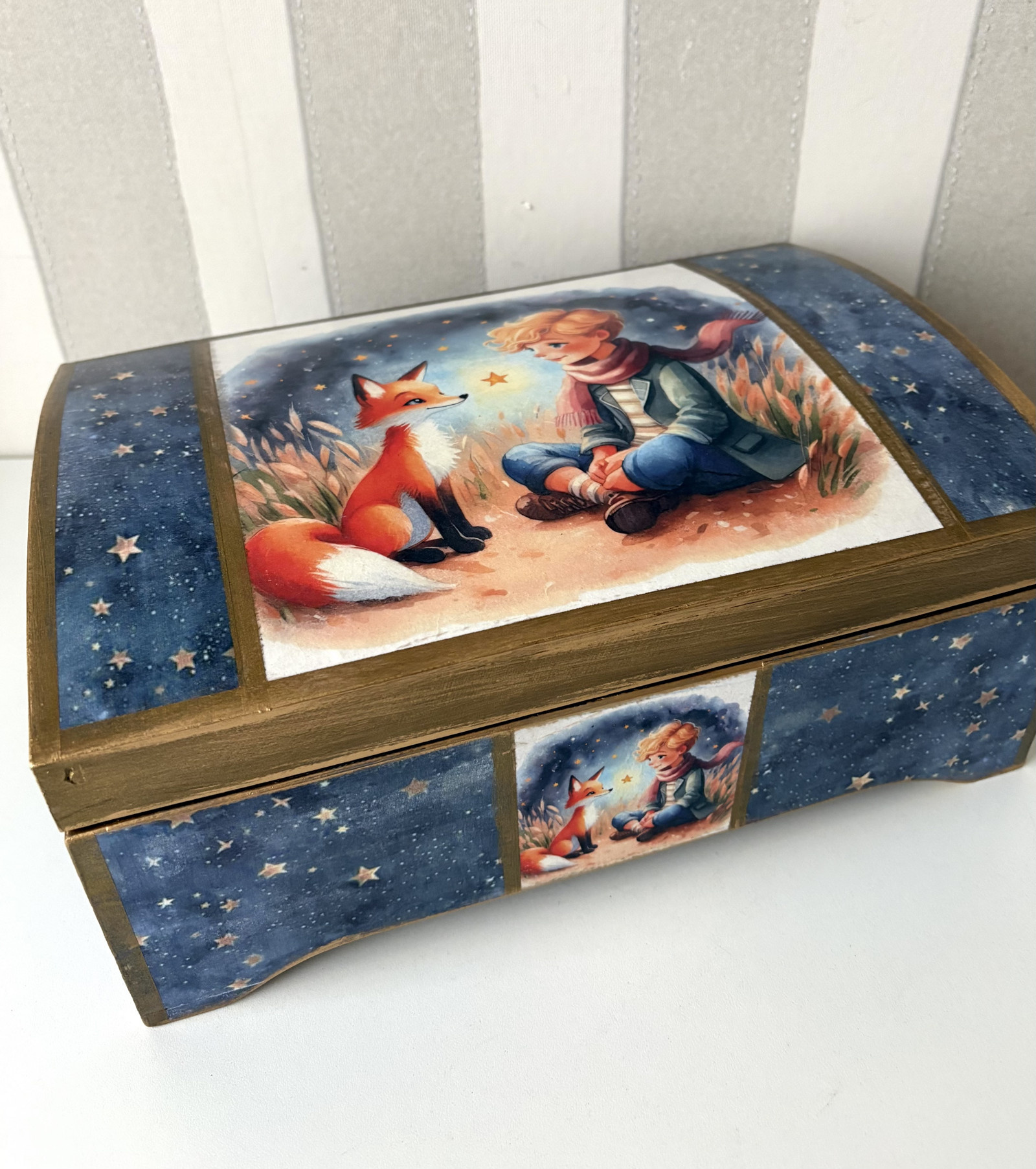 Velká, krásná, jedinečná, originální, romantická, dřevěná truhla šperkovnice Malý princ na Vaší poklady. Je vyrobená z borovicového dřeva, ručně domalovaná a zdobená pomocí techniky decoupage, následně je patinovaná, lakovaná a voskovaná pro přídaní truhličce hedvabního povrhu. Uvnitř je barvená a lakovaná. Lze otírat vlhkým hadříkem.