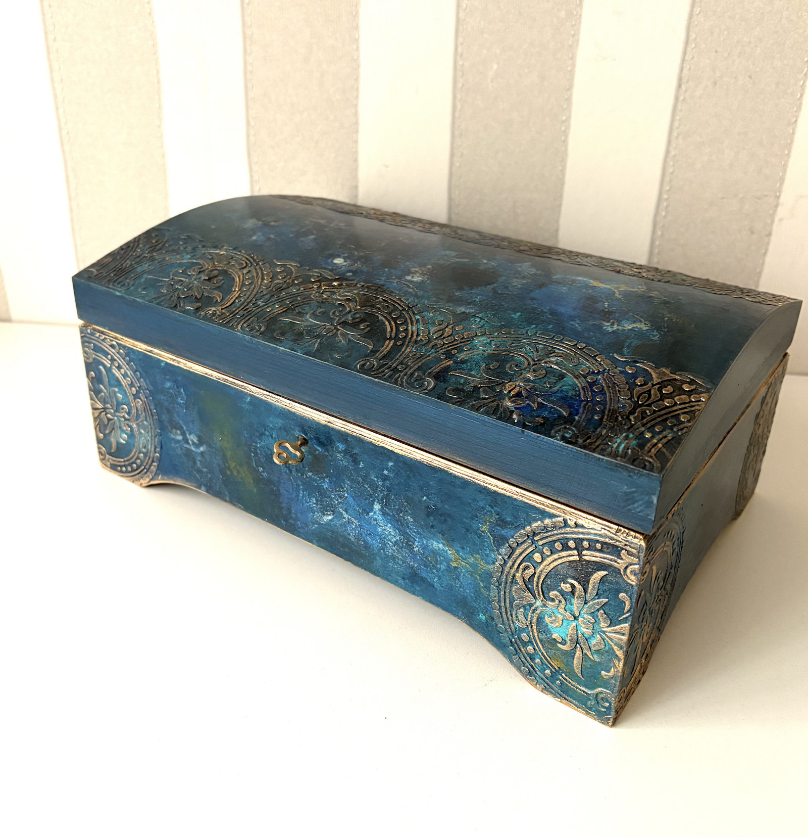 Velká, krásná, jedinečná, originální, romantická, dřevěná truhla na klíč, šperkovnice jako svatební dar nebo na velké poklady, šperky, hodinky apod. Je vyrobená z borovicového dřeva a je zdobená pomocí různých vytvarných technik. Krabička je natřena akrylovými barvami a důkladně přelakována akrylovým lakem. Lze otírat vlhkým hadříkem.