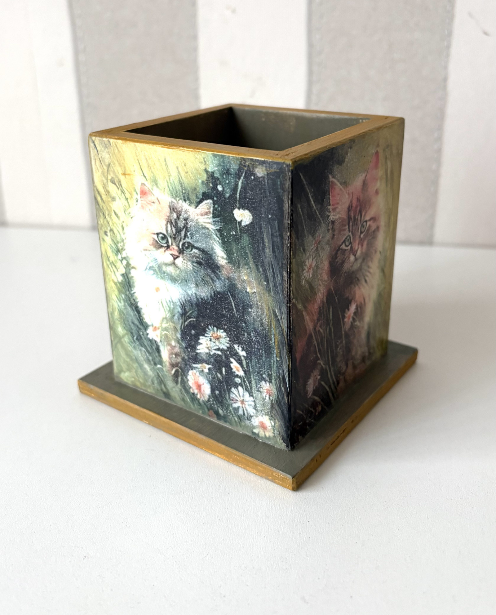 Dřevěná otevřená krabička- tužkovník nebo zásobník na cokoliv. Je zdobeny pomocí techniky decoupage, ručně domalováný,patinovaný a lakovany .Praktický pomocník pro školáky, do kuchyně, na psací stůl. Můžete využít i jako atypickou vázičku na suché květiny. Povrch je lakován kvalitním akrylovým lakem. Uvnitř je mořený a lakovaný. Lze otírat vlhkým hadříkem.