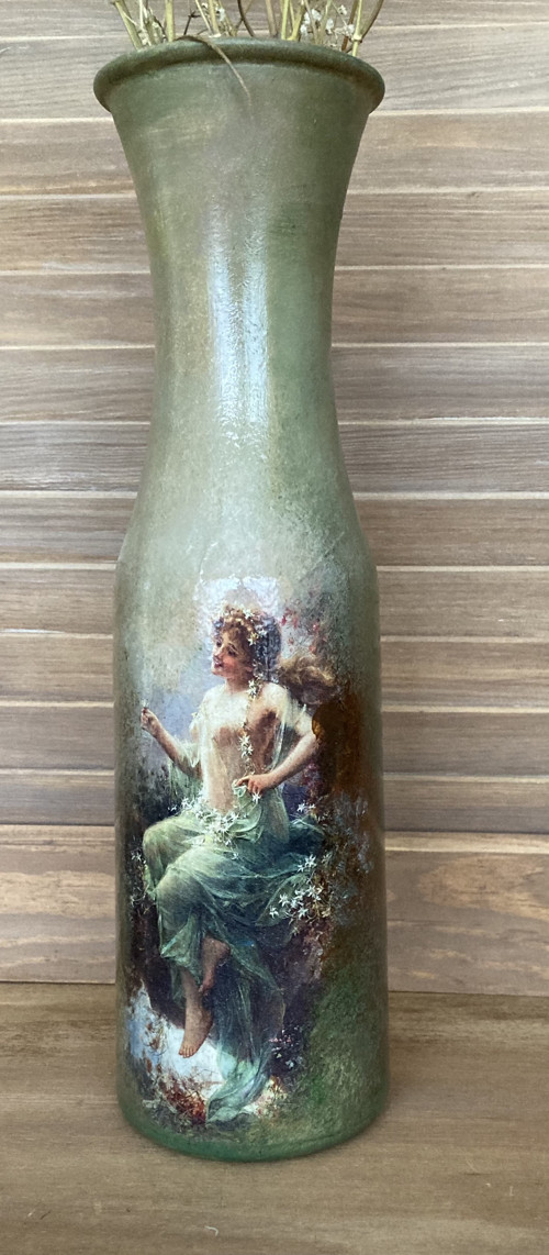 Skleněná váza dekorovaná speciálními technikami, včetně náročné techniky decoupage na sklo s následným ručním domalováním. Uvnitř váza zůstala skleněná.