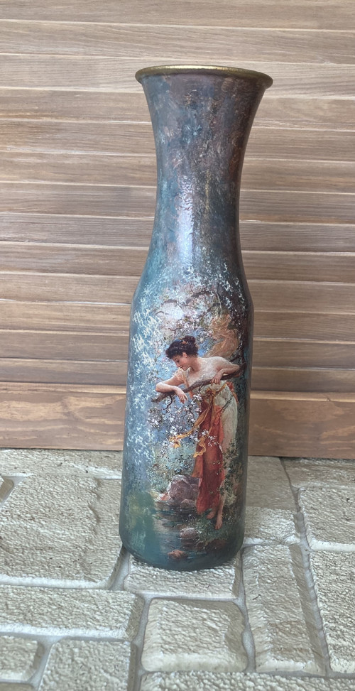 Skleněná váza dekorovaná speciálními technikami, včetně náročné techniky decoupage na sklo s následným ručním domalováním. Uvnitř váza zůstala skleněná.