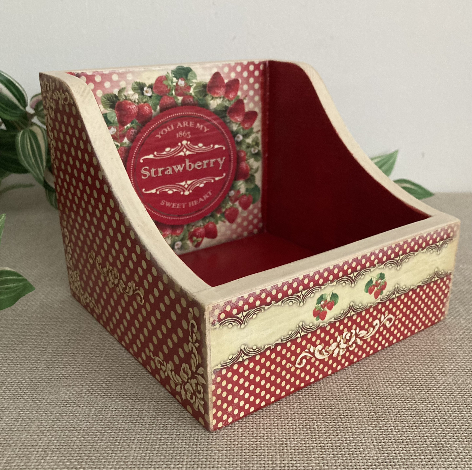 Dřevěný zásobník na drobnosti, košík, dochucovačka na koření nebo na různé předměty. Krabička je zdekorovaná pomocí různých dekoračních technik a techniky decoupage,zdobená ručně vyrobanými elementy, ručně domalovaná, patinovaná a lakovaná kvalitním akrylovým lakem. Jje možné ho používat na potraviny. Ošetřený povrch je odolný vůči vínu, pivu, kole, kávě, čaji, ovocným šťávám, mléku a vodě, nezanechává stopy. Po zaschnutí je nátěr neškodný pro lidi, zvířata a rostliny.