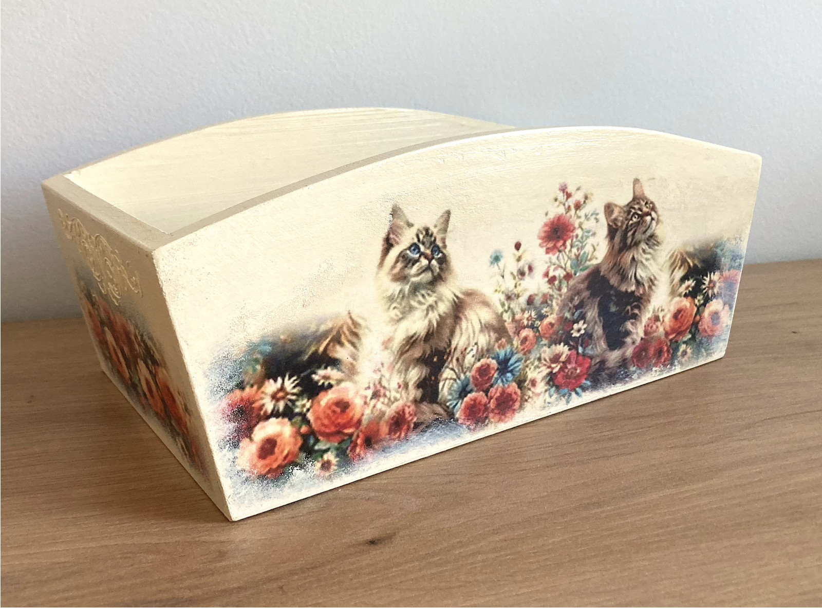 Dřevěný košík, truhlík, zásobník vhodný na šitíčko, ozdoby do vlasů a hřebínky, potřeby pro malování a kreslení, drobnůstky v kuchyni, na ovoce nebo pečivo, na velikonoční výzdobu, vánoční aranžmá, na bylinky a květiny, vajíčka, ovoce, sladkosti , atd. Je vyrobený ze smrkového dřeva, Barvený, zdobený technikou decoupage a následně ručně domalovaný. Je lakovaný kvalitním akrylovým lakem s atestem na dětské hračky. Lze otírat vlhkým hadříkem.