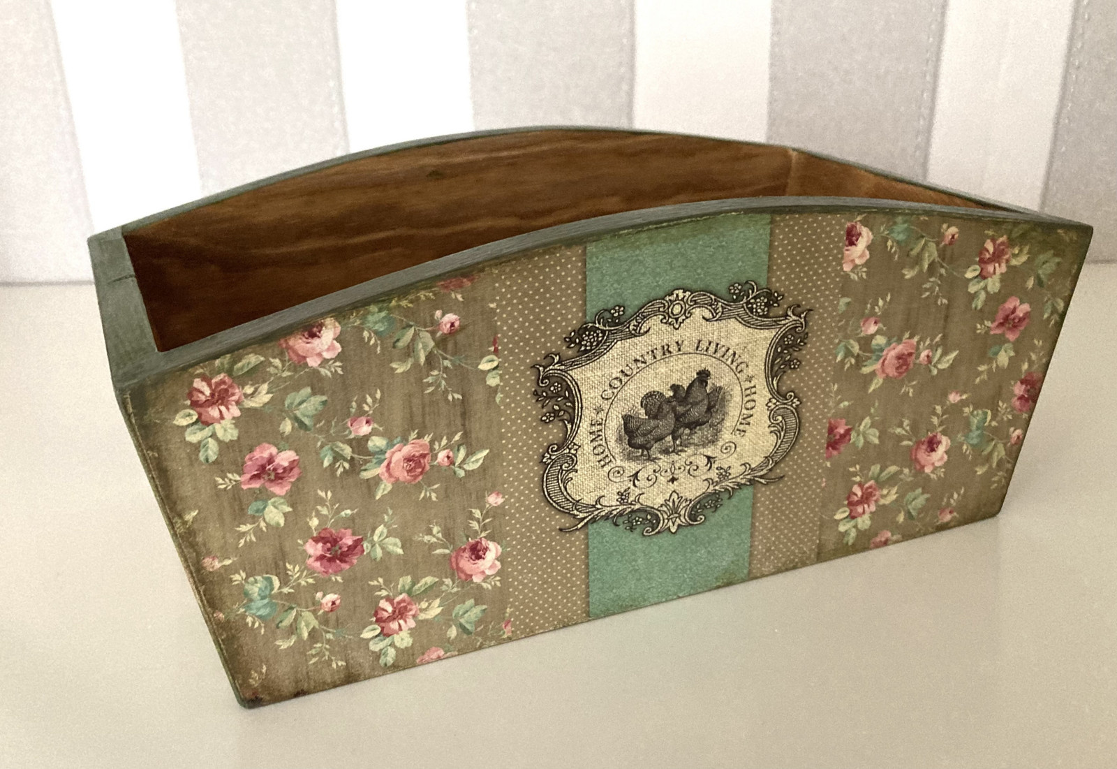Dřevěný košík, truhlík, zásobník vhodný na šitíčko, ozdoby do vlasů a hřebínky, potřeby pro malování a kreslení, drobnůstky v kuchyni, na ovoce nebo pečivo, na velikonoční výzdobu, vánoční aranžmá, na bylinky a květiny, vajíčka, ovoce, sladkosti , atd. Je vyrobený ze smrkového dřeva, Mořený, zdobený technikou decoupage a následně ručně domalovaný. Je patinovaný a lakovaný kvalitním akrylovým lakem s atestem na dětské hračky. Lze otírat vlhkým hadříkem.