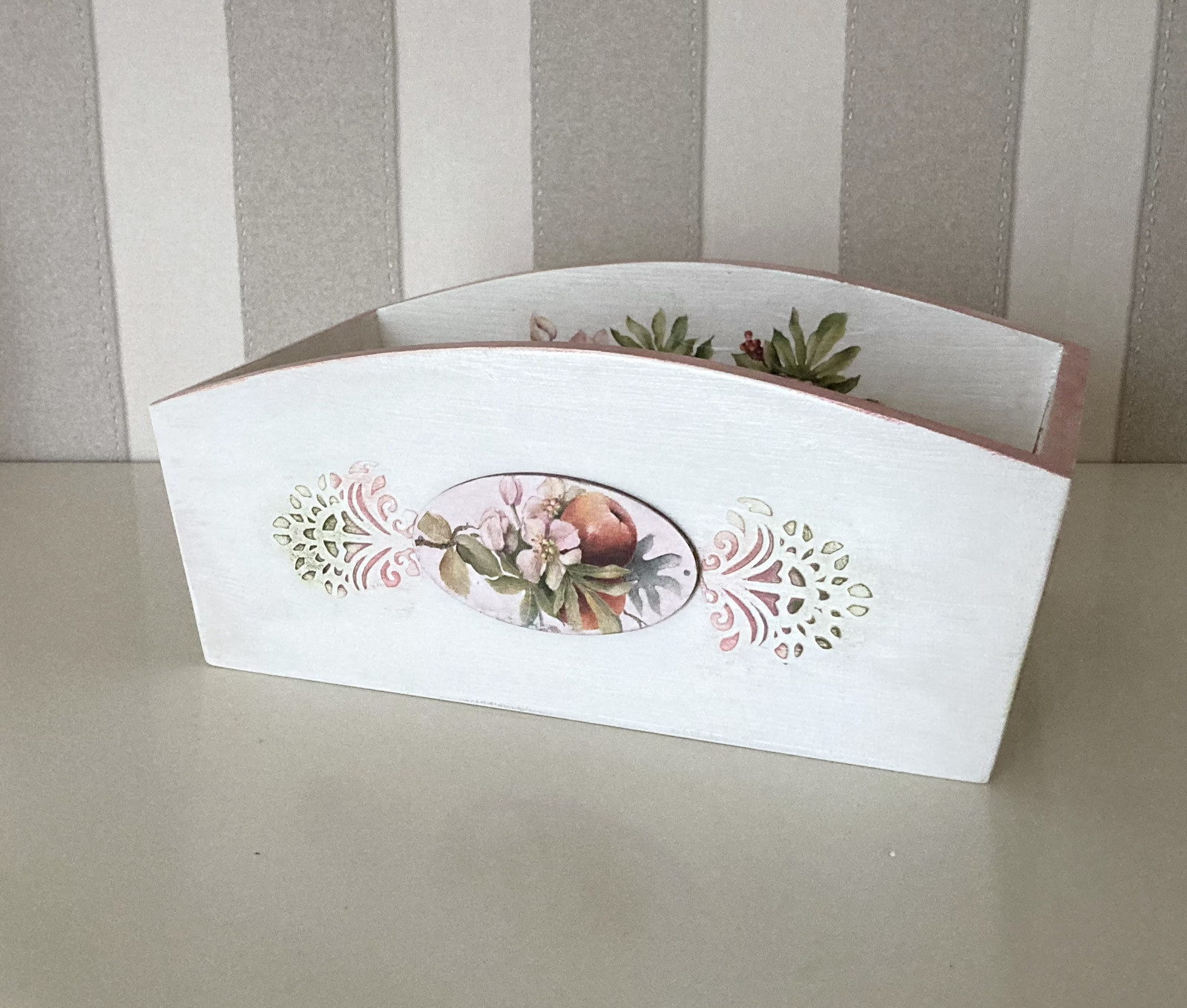 Dřevěný košík, truhlík, zásobník vhodný na šitíčko, ozdoby do vlasů a hřebínky, potřeby pro malování a kreslení, drobnůstky v kuchyni, na ovoce nebo pečivo, na velikonoční výzdobu, vánoční aranžmá, na bylinky a květiny, vajíčka, ovoce, sladkosti , atd. Je vyrobený ze smrkového dřeva. Je patinavaný a lakovaný kvalitním lakem s atestem na dětské hračky. Lze otírat vlhkým hadříkem.